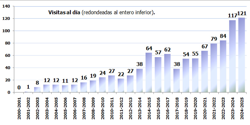 El sitio Web 'masias.org' ha cumplido 25 años. Empezó a funcionar el 1 de agosto de 2000 a las 00:00 horas y a las 23:59:59 horas del día 31 de julio de 2025 cumplió veinticinco años. En la imagen puede ver la evolución de la media de visitas reales por día en cada ejercicio (consideramos un ejercicio el tiempo que ve desde el 1 de agosto de un año al 31 de julio del año siguiente).